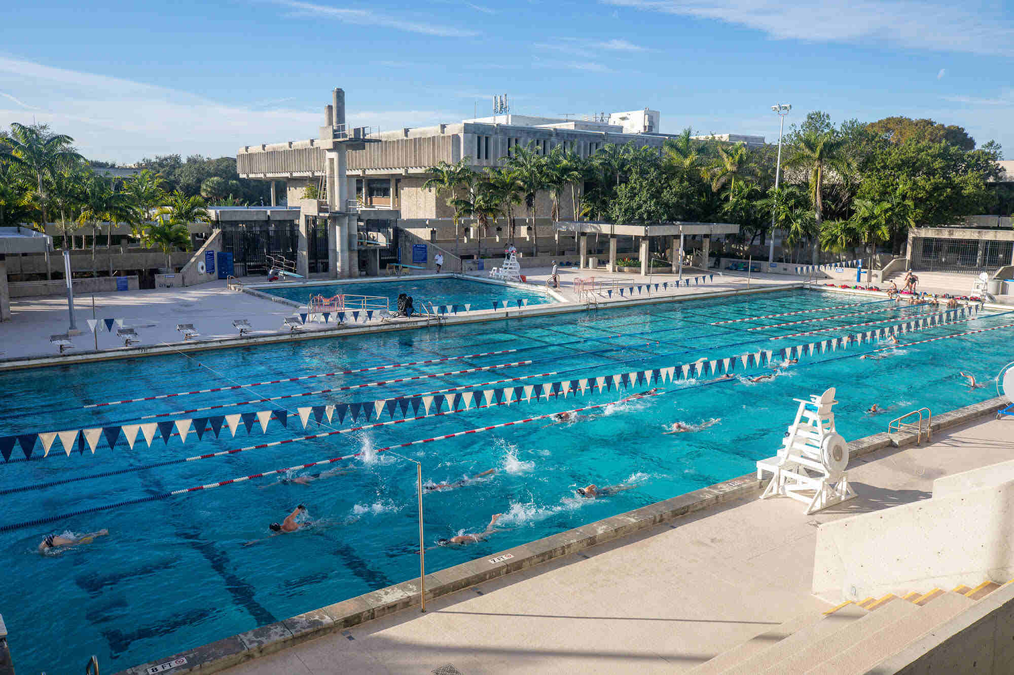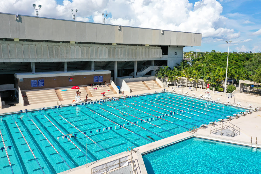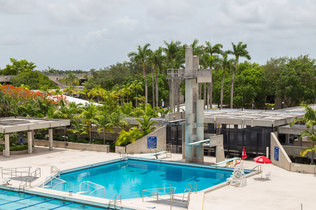 The Aquatic Center at Miami Dade College's Kendall Campus is a premier facility located within the Gibson Center, adjacent to the Fitness and Wellness Centers. It features an Olympic-sized competition pool and a 10-meter diving well, serving both recreational and competitive purposes.